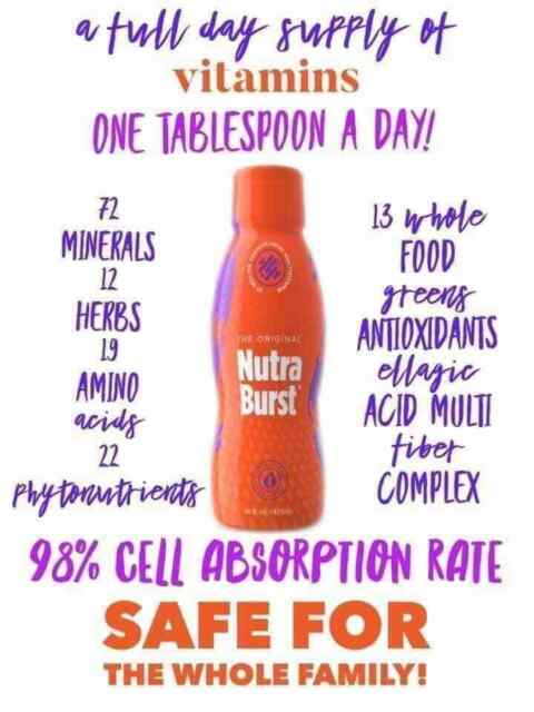 Nutra Burst is much more than a daily vitamin supplement. The bonded mineral base works to detoxify your system while supplying essential elements to strengthen your body. The benefit of a liquid supplement increases the bioavailability of vitamins by six to eight times over traditional tablets. In addition, the liquid formula delivers an active blend of enzymes and nutrients found nowhere else. This complex multi-vitamin blend contains 13 elements including Ginseng, Grapeseed Extract, Green Tea Extract and Kelp. The amino acid complex includes the eight essential amino acids as well as the proteinogenic amino acids: L-Argenine, Aspartic Acid, Cystine, Glycine and Glutamic Acid. In addition, Nutra Burst is unmatched in its Phytonutrient Enzymes and Whole Food Greens blends.